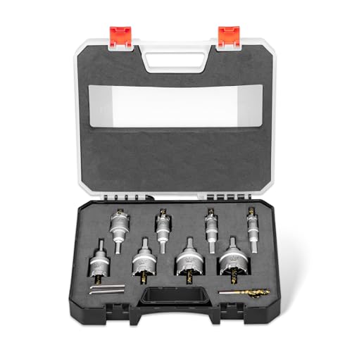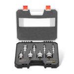 SALIの超硬ホールソーセットは、16mmから40mmまで8サイズの刃が揃い、石膏ボードや木材、鉄板に対応。電動ドリル・ドライバーで簡単に使用可能。収納ケース付きで便利です。