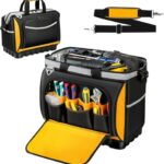 大容量のツールバッグは肩掛けベルト付きで、25ポケットを備えた1680Dオックスフォード製。自立できるプラスチック底部で、バイクや作業用に最適。
