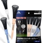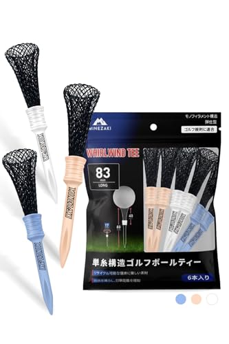 Minezakiの旋風ティーは、モノフィラメント構造で弾性型。幅17mmのアップグレードヘッドはボールの乗せやすさを追求。長さ83mmのロングティーが6本セットで、ゴルフコンペやアクセサリーに最適です。