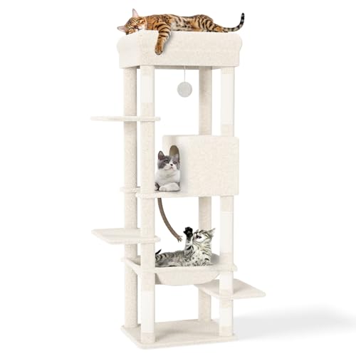 CozyMeowキャットタワーは、スリムデザインで置きやすく、ハンモックやキャットハウスがあり、大型猫にも対応。爪とぎやキャットウォークがあり、運動不足解消に最適。150cmの高い安定性を持ち、多頭飼いにも人気。