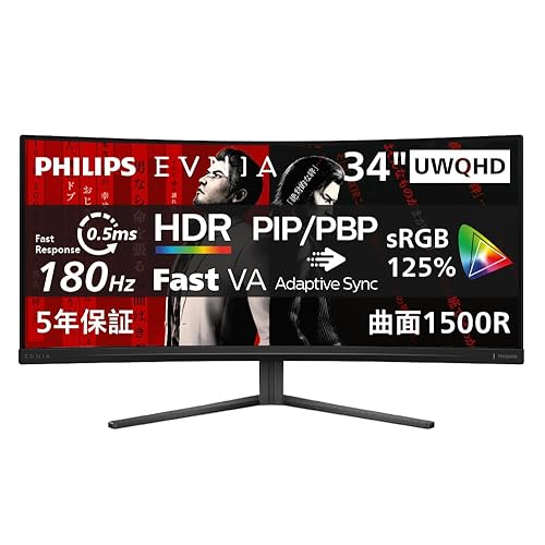 PHILIPS EVNIA 34M2C3500L/11は、34インチの湾曲ゲーミングモニターです。UWQHD@180Hz、曲面1500R、超高速0.5ms、Adaptive Sync対応。HDMI2.0x2、DP1.4、5年保証付き。