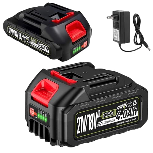 マキタ互換バッテリー2個セット。21V/18V、4.0Ahと2.0Ahの大容量リチウムイオンバッテリー。LED電池残量表示、長時間作業可能。多彩な保護機能、小型・軽量。バッテリー充電器付属、PSE認証済。