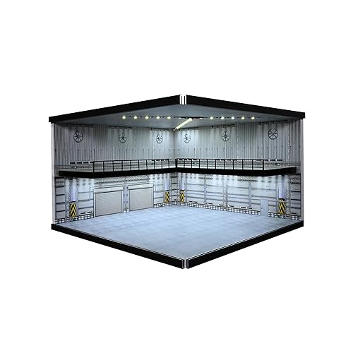 1/64スケールのジオラマカーガレージモデル。LED照明付きのダイキャストカー収納ケースで、ホットウィールやトミカのコレクションに最適なダブルデッカーカーショールーム。
