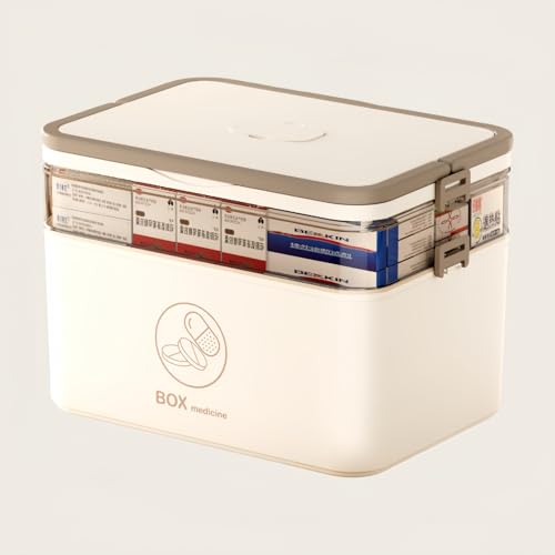 おしゃれで超大型の救急箱。2層・3層の仕切り付きで、薬や小物をしっかり収納可能。家庭用、旅行用、車載用に最適で、防水・防塵機能もあり。淡い茶色のデザインがかわいい。
