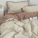 布団カバー セミダブル 4点セット。掛け布カバー、シーツ、ベッドカバー、枕カバー付き。綿100%で洗える。防ダニ、四季通用、速乾タイプ。優しい肌触りと柔らかさを兼ね備えたベージュの寝具です。