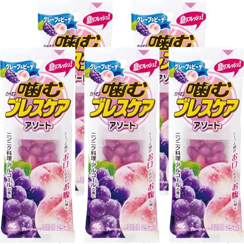 噛むブレスケア 息リフレッシュグミは、2つの味が楽しめる25個入りの5個セットです。口臭対策に最適で、手軽にリフレッシュできるアイテムです。