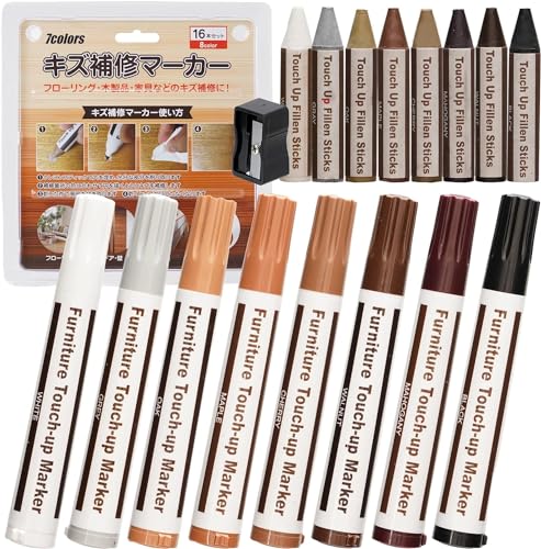 7colorsキズ補修マーカーは、8色・16本セットの傷補修キットです。フローリングや木製家具、ドアの傷を簡単に修復でき、クレヨンのように使えるので手軽にキズ隠しが可能です。削り器付きで更に便利。