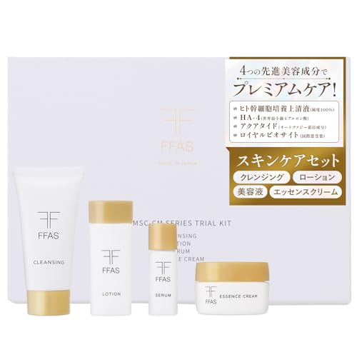 FFASスキンケアセットは、クレンジング、化粧水、美容液、クリームの4点を含み、ヒト幹細胞や世界最小ヒアルロン酸を使用した無添加のエイジングケア製品です。たるみ、しわ、くすみをケアし、旅行やトライアルにも適しています。