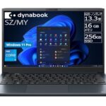 dynabook SZ/MYは、13.3型抗菌ボディのモバイルノートPCです。Windows 11 Pro搭載、第13世代Core i5、SSDを搭載し、オニキスブルーのカラーが特色です。