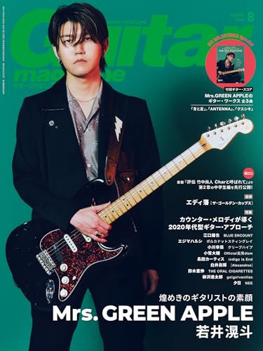 ギター・マガジン2025年8月号の表紙は若井滉斗(Mrs. GREEN APPLE)。付録として全3曲収録のMrs. GREEN APPLEギター・スコア集が付いています。