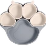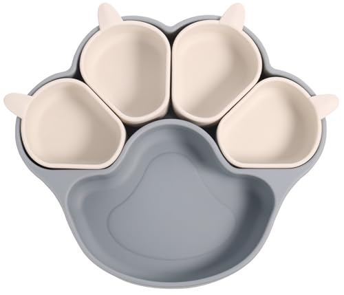 ベビー食器セットは5つのグリッドがあり、吸盤付きでひっくり返らない設計。食品級シリコン製で滑り止め効果もあり、離乳食に最適です。かわいいカラフルデザインで出産祝いにもおすすめ。