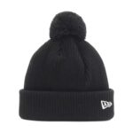ニューエラのキッズポンポン付きニット帽。無地ブラックで、FREEサイズ。暖かく、スタイリッシュなデザインで、冬のおしゃれにぴったり。