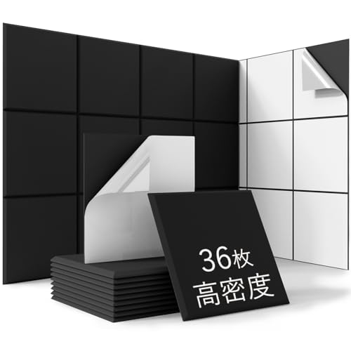 Evenreachの自己粘着吸音材は、高密度200kg/m³で防音効果があります。難燃・防潮機能を備え、室内装飾に最適な30cm×30cm×0.9cmのシートが36枚入り(3.24㎡)。