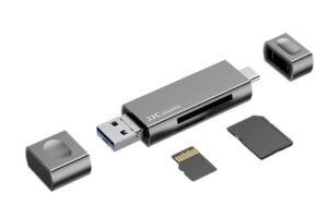 JJC ポータブルメタル USB-C USB-A SDカードリーダー microSD TFアダプター デュアルスロット iPhone 17 16 15 Pro Max、Mac、MacBook、iPad、コンピューター、ラップトップ、スマートフォン用 USB 3.0 高速 90MB/秒 – グレー