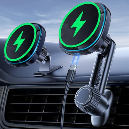 ワイヤレス充電とマグネット機能を搭載したスマホホルダー。15W急速充電、冷却ファン付き。iPhone 16/15/14/13/12シリーズやAndroid全機種に対応。伸縮アームで片手操作可能。安定性抜群で99%の車種に対応。