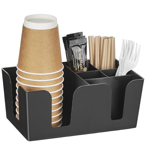 MYITYARDのプラスチックカップホルダーは、コーヒーステーション用のオーガナイザーです。使い捨てカップ、ペーパータオル、ストロー、スプーン、攪拌機を整理できます。カウンタートップに最適なブラックデザイン。