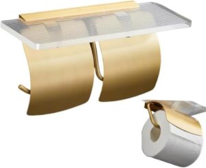 GOTRAFY トイレアルミニウム+アクリルペーパーホルダー 多機能棚付き 2種類取り付け方法選べる エレガントデザイン トイレ・バスルーム・キッチン用 (カバー付き – ショート,ゴールデン)