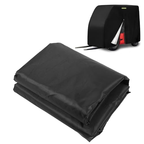 フォークリフトカバーは210dオックスフォード生地製、ウォーターレジスト加工。サイドジッパー付きで、反射ストリップ装備。最大8000ポンド対応、サイズ104.3″x49.2″x80.3″。