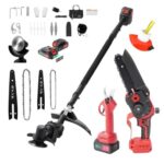Infinity8の高枝切りチェーンソーは、電動草刈り機と互換性のある20点セットです。剪定ばさみ、延長ポール、充電式バッテリー2個、充電器を含み、最長2.3mまで延長可能。意匠権登録済みの8インチチェーンソーです。