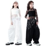 ヒップホップキッズダンス衣装セットアップ。へそ出しタンクトップとメッシュダボダボスボン。カジュアルなブラックとホワイトが特徴。発表会やステージでの華やかな演出に最適。サイズ160。