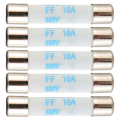 デジタルマルチメーターヒューズ、10A、600V DC対応。速効性のニッケルメッキ真鍮製で、セラミックボディを採用。サイズは6.3x32mmで、5パック入り。