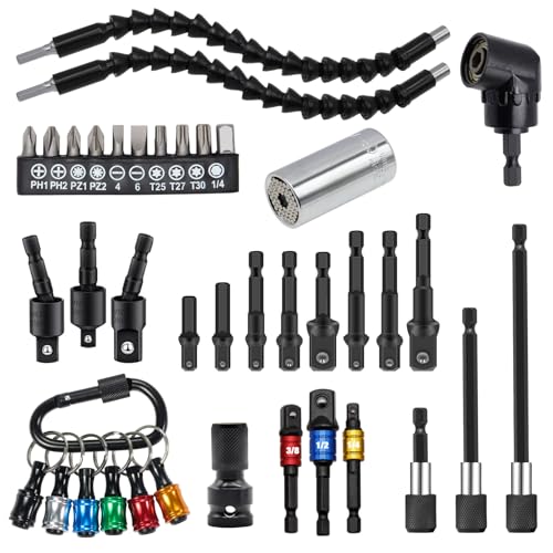 FiLwWの38点セットは、105°アングルドリルが特徴。曲げ延長ドリル、ビットホルダー、ドライバービットキット、六角ソケットアダプター、ユニバーサルソケットレンチが含まれ、様々な作業に対応します。