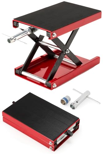 耐荷重500kgの小型バイクジャッキ。ハーレーにも対応し、ソケットアダプタ付き。コンパクト設計で、バイクメンテナンスやリフト作業に最適なモーターサイクルスタンドです。