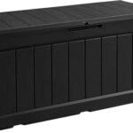 物置収納庫310Lは、大容量で幅116cm、奥行54cm、高さ58cmの屋外収納庫です。ベンチ代わりにも使え、おしゃれなブラックカラーでガーデンやベランダに最適です。アウトドア収納にも便利です。