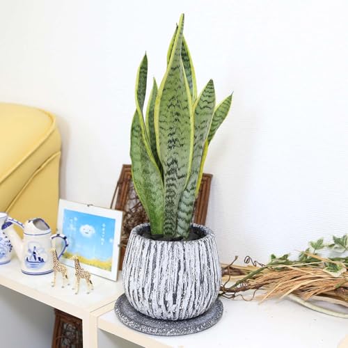 ブルーミングスケープのサンスベリア 5号は、空気を浄化するとされる観葉植物です。ブラックグレーの丸セメント鉢に、土の表面には竹炭を使用。しずくモダン形のデザインで、鉢皿付きです。