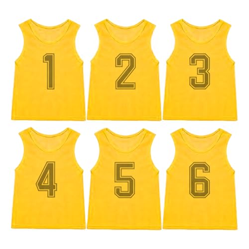 LEVANAのビブスは子供用と大人用の6枚セット。番号入りで通気性抜群の軽量メッシュ素材。男女兼用、サッカーやバスケ、運動会に最適。色はイエロー。