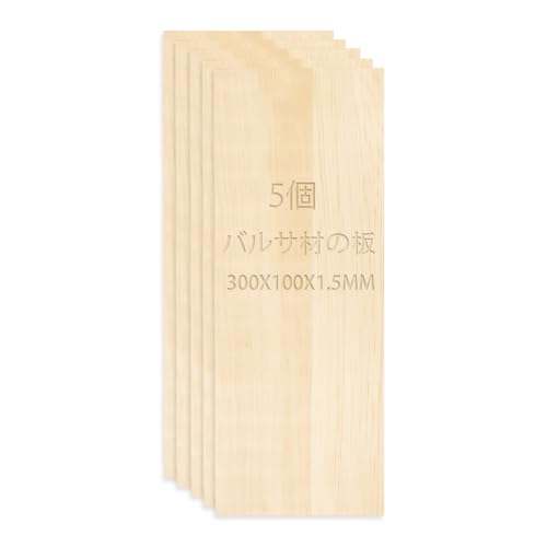 バルサ材シート5枚セット。サイズ300 x 100 x 1.5mm。未仕上げの天然木製プレートで、模型作りやDIY、学校プロジェクトに最適です。軽量で加工しやすい素材です。