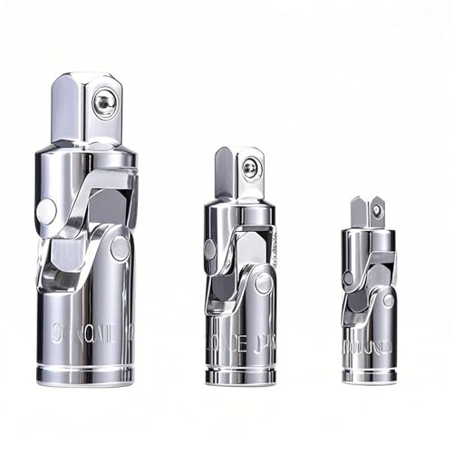 ユニバーサルジョイントスリーブは、1/4"、3/8"、1/2"の各サイズに対応し、360°回転可能です。3個セットで、様々なソケットに適応しています。