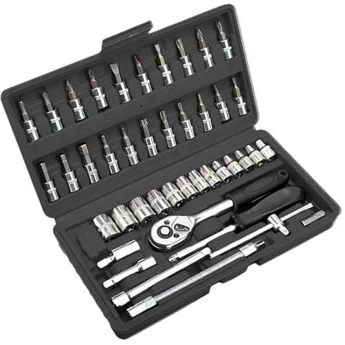 ソケットレンチセット46点、用途に応じた豊富なサイズのソケットやレンチを含む便利な工具キット。頑丈なケース付きで持ち運びも簡単。家庭やプロのメンテナンス作業に最適。