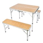 Fkstyleの折りたたみテーブルセット。椅子は収納式で、高さは2段階調節可能。サイズは幅90×奥行60cm、軽量アルミ製でキャンプやBBQに最適。持ち運びに便利でコンパクトに収納可能。カラーはナチュラル/シルバー。