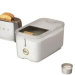 YAKINOの角型密閉米バケツは、10kg/15kgの容量を持ち、透明スライドカバー付き。PP製で滑車付、残留窓もあり、家庭用米貯蔵に最適。計量カップが付属し、ブラックのLサイズです。