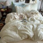 布団カバーセット(ストライプ・北欧風)、セミダブルサイズ。優しい肌触りのピーチスキン加工、フリル付き。丸洗いOKで安心・清潔、通気性抜群。四季通用のお洒落な寝具です(ベージュ)。