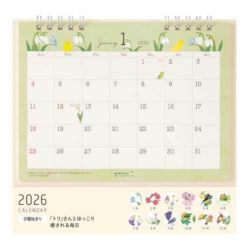 ミドリ 2026年 卓上カレンダー Mサイズ、トリ柄デザイン。サイズは約15x20cmで、可愛い鳥のイラストが特徴。日付部分には必要なメモも書き込みやすく、デスクを彩るアイテム。