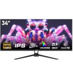 AESNO 34インチ ウルトラワイドモニターは、WFHD 120HzのIPSパネルを搭載。解像度2560×1080、120%sRGB対応、350cd/m²の高輝度。HDMI/DP、FreeSync対応、傾斜調整、壁掛けも可能。三年保証。