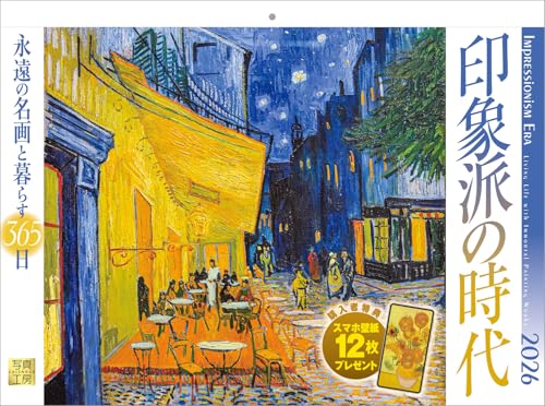 写真工房カレンダー | 印象派の時代 2026カレンダーは、壁掛けタイプの風景絵画カレンダーです。300×400mmの紙ホルダー付で、スマホ壁紙12枚もダウンロード可能。