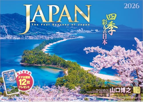 「写真工房カレンダー | JAPAN 四季彩りの日本 2026」は、壁掛けタイプの風景カレンダー。透明ホルダー付きで300×420mmのサイズ。スマホ壁紙12枚も付いており、四季折々の美しい風景を楽しめます。