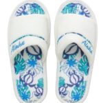 ハワイアンホヌプルメリアのシェル柄スリッパ。メンズ・レディース用でサイズ23-27cm。ふかふかのルームシューズとして人気で、トイレや室内で使えます。可愛いインテリアにも最適。