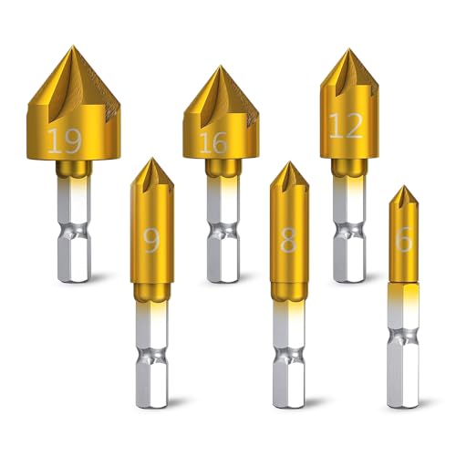 高速度鋼製の皿取り錐ドリルセット。ビットサイズ6mm-19mm、82度センター設計。5フルート構造で効果的な切削。六角軸で安定性抜群。木工やバリ取りに最適な電動工具。