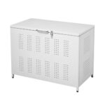 屋外ゴミ収納庫は大容量210Lで、カラスや野良猫の荒らし対策に最適。ホワイトとメタル仕様で庭にぴったりのデザイン。