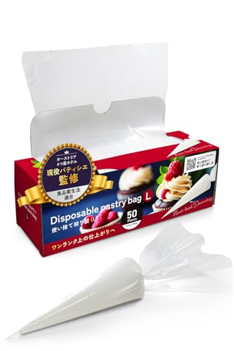 現役パティシエ監修の絞り袋、50枚入りLサイズ(21cm×39cm)。食品衛生法に適合しており、安全にお菓子作りが楽しめます。ちょうど良い厚みで扱いやすく、プロの仕上がりを実現します。