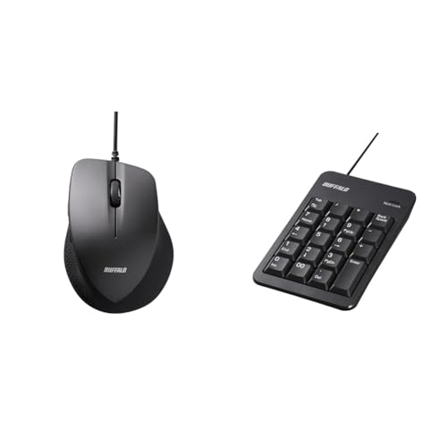 バッファローのUSBマウス(BSMBU19BK)は有線で5ボタン、静音設計。戻る/進むボタン搭載。BlueLED対応。テンキーボード(BSTK100BK)はTabキー付きで使いやすい。共にブラック。