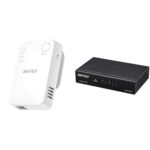 バッファローのWiFi中継機WEX-1166DHPL/NはWi-Fi 5(11ac)対応で、最大866 + 300 Mbpsの速度を実現。エコパッケージ仕様。5ポートのスイッチングハブLSW6-GT-5ESL/NBKは金属筐体で壁掛け設置可能。