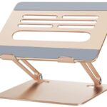 折りたたみ式ノートパソコンスタンド。人間工学設計で高さ・角度調整可能。腰痛や猫背の改善に効果的。15.6インチまで対応。シャンパンゴールドカラー。外付けキーボード推奨。