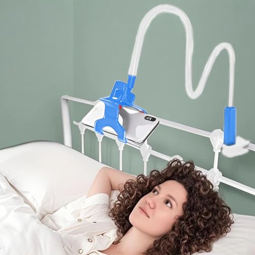 フレキシブルアームを搭載したベッド用電話ホルダースタンド。調節可能な携帯電話マウントクランプで、デスクやベッドフレームに対応。色はブルーです。