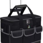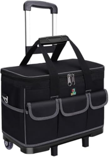 GEBYUIツールバッグは、17インチの大口収納が可能で、持ち運びに便利な小型キャスター付き。耐久性のあるオックスフォード素材で、電気技師や大工に最適な多機能設計です。