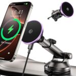 GuMoshの車載マグネット式ワイヤレス充電器は、15W対応、真空吸盤で固定、超強磁力を持ち、12〜17cmの伸縮アームで調整可能。360°回転、片手操作、LEDライト付きでiPhone16/15/14/13/12シリーズに対応。